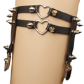 Tyylikäs musta jalkaharness jossa kaksi sydäntä, piikit ja klipsit stay-up sukkien ylhäällä pitoon. Harnessin takaosa on venyvää kuminauhaa ja sopiikin hyvin kaikenkokoisille.