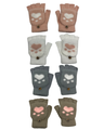 Pörröiset kissantassu kynsikkäät, joissa napilla kiinnitettävä lapanen, jonka voi halutessaan vetäistä sormien päälle.