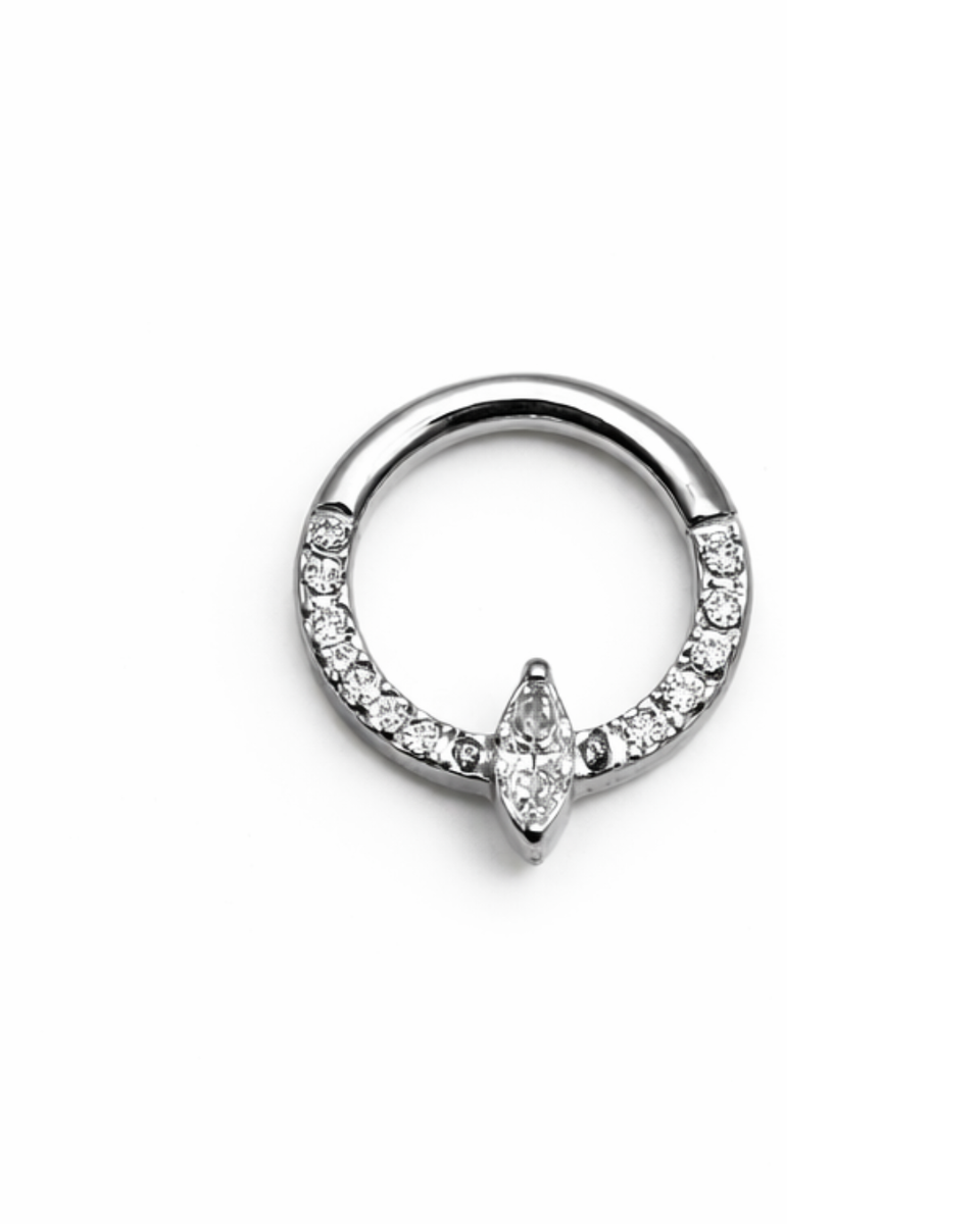 Clicker rengas timanteilla, joka sopii moneen lävistykseen. Avautuu ja sulkeutuu napsauttamalla kiinni. Kirurginteräs.