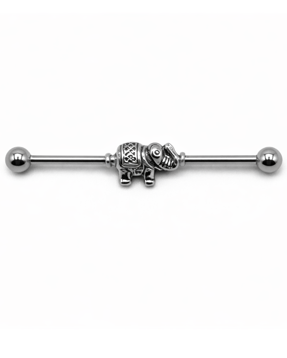 Kirurginteräksinen industrial barbell lävistyskoru norsulla. Korussa on ulkokierteet.