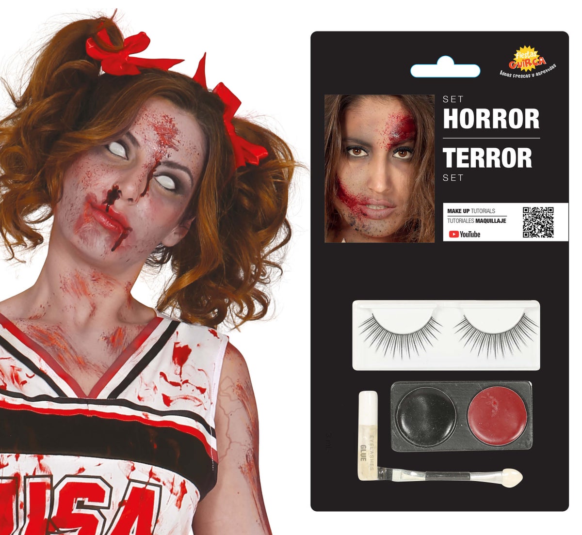 Maskeeraussetti halloween maskeerauksiin! Mukana musta ja punainen kasvomaali, aplikaattori, ripset ja ripsiliima.