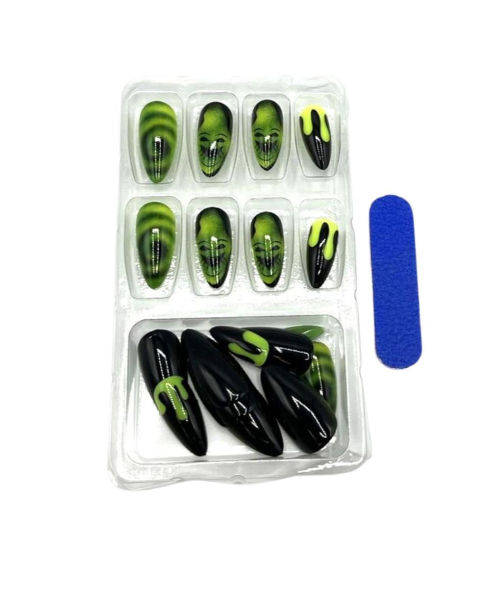 Upeat halloween- teemaiset tekokynnet. Mukana kynsitarrat ja kynsiviila kiinnitystä varten. Sisältää 24kpl kynsiä.