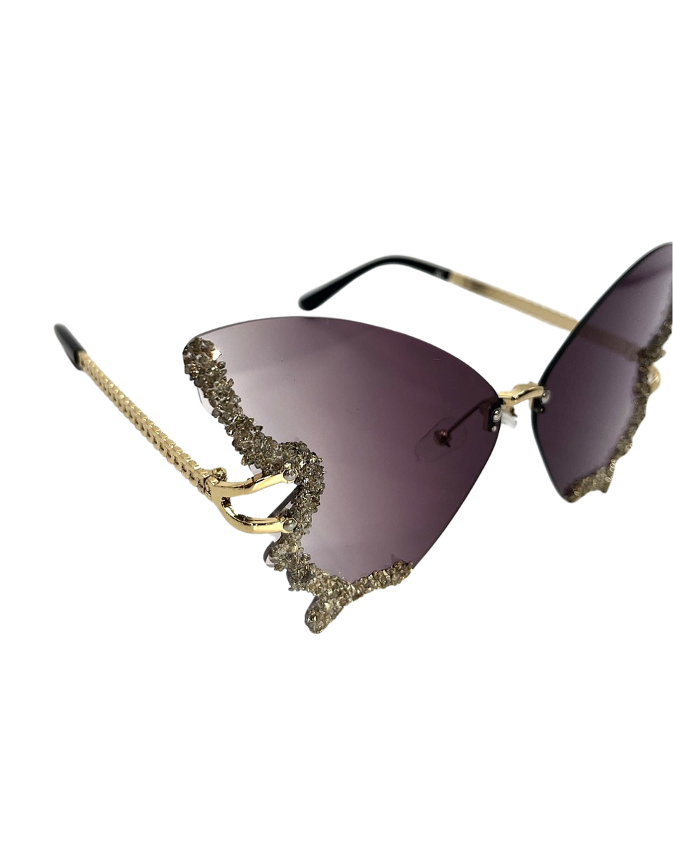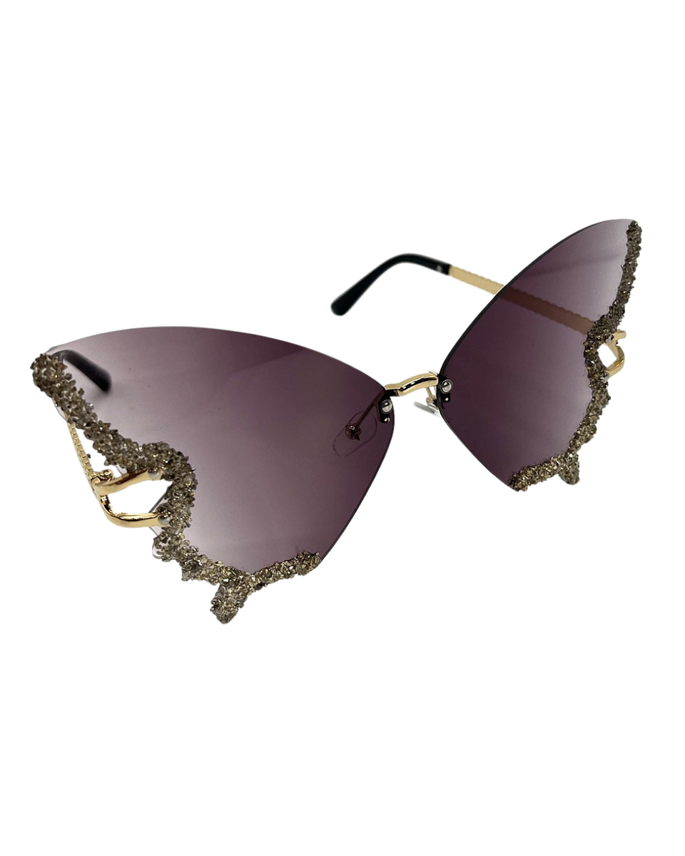 Upeat liukuvärjätyt ruskeat aurinkolasit, joissa perhosen siiven mallinen kehys ja glitterillä koristellut ulkoreunat tuovat ripauksen glamouria joka asuun.