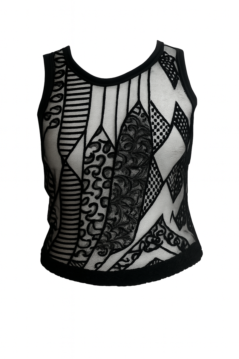 Tyylikäs läpinäkyvä mesh-toppi mustalla kuvioinnilla. Trendikäs valinta juhliin tai arkeen.