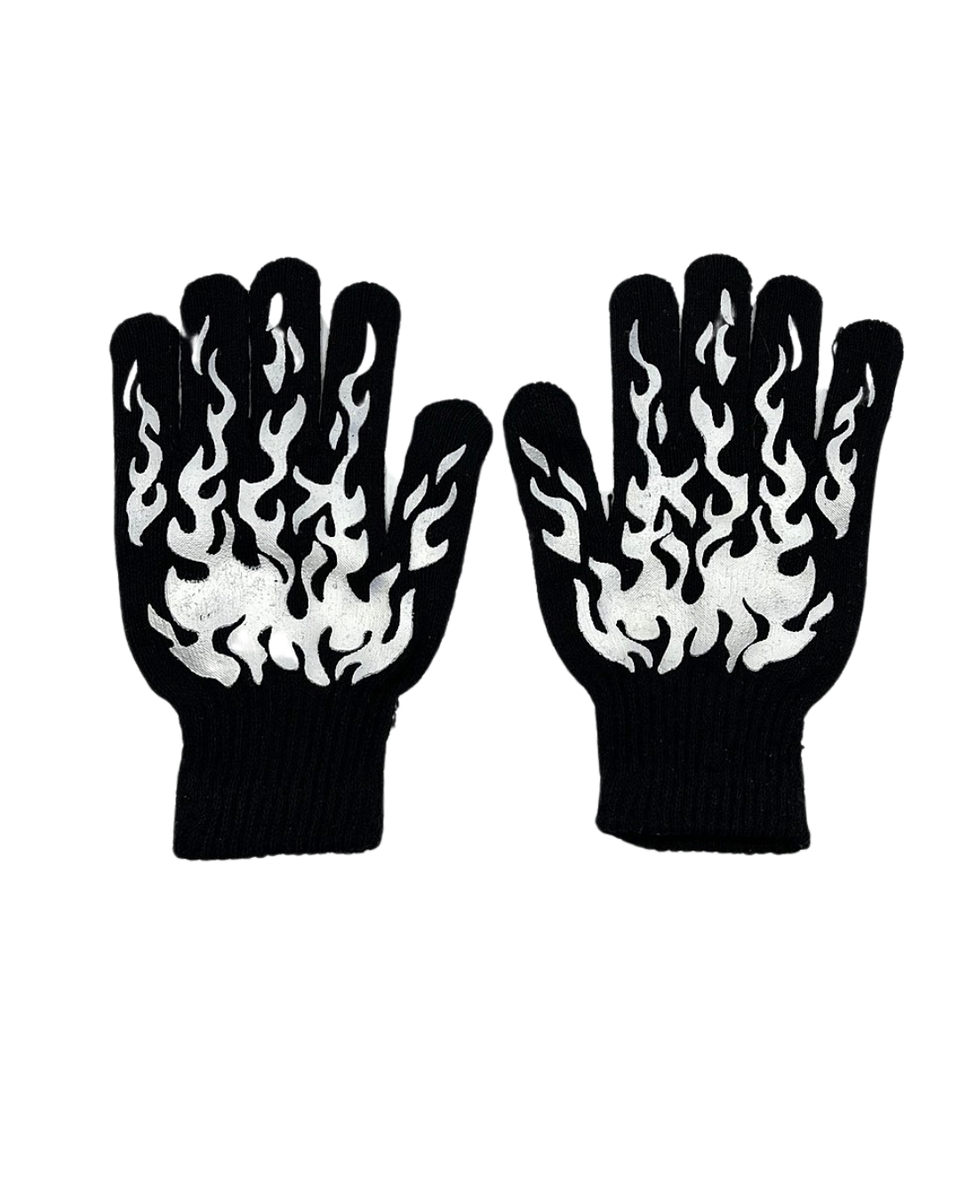 Tyylikkäät mustat neulehanskat, joissa valkoiset liekkikuviot tuovat rohkean ja uniikin ilmeen. Pehmeä ja joustava materiaali tekee niistä mukavat käyttää kylminä päivinä. Täydellinen valinta, kun haluat lisätä asuusi ripauksen asennetta ja katu-uskottavuutta.