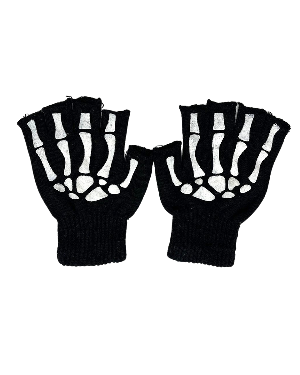 Näyttävät mustat kynsikkäät, joissa on valkoiset luurankokuvioinnit. Tyylikäs ja mukava valinta viileisiin päiviin tai asusteeksi esimerkiksi halloween-asuun tai rock-henkiseen tyyliin.