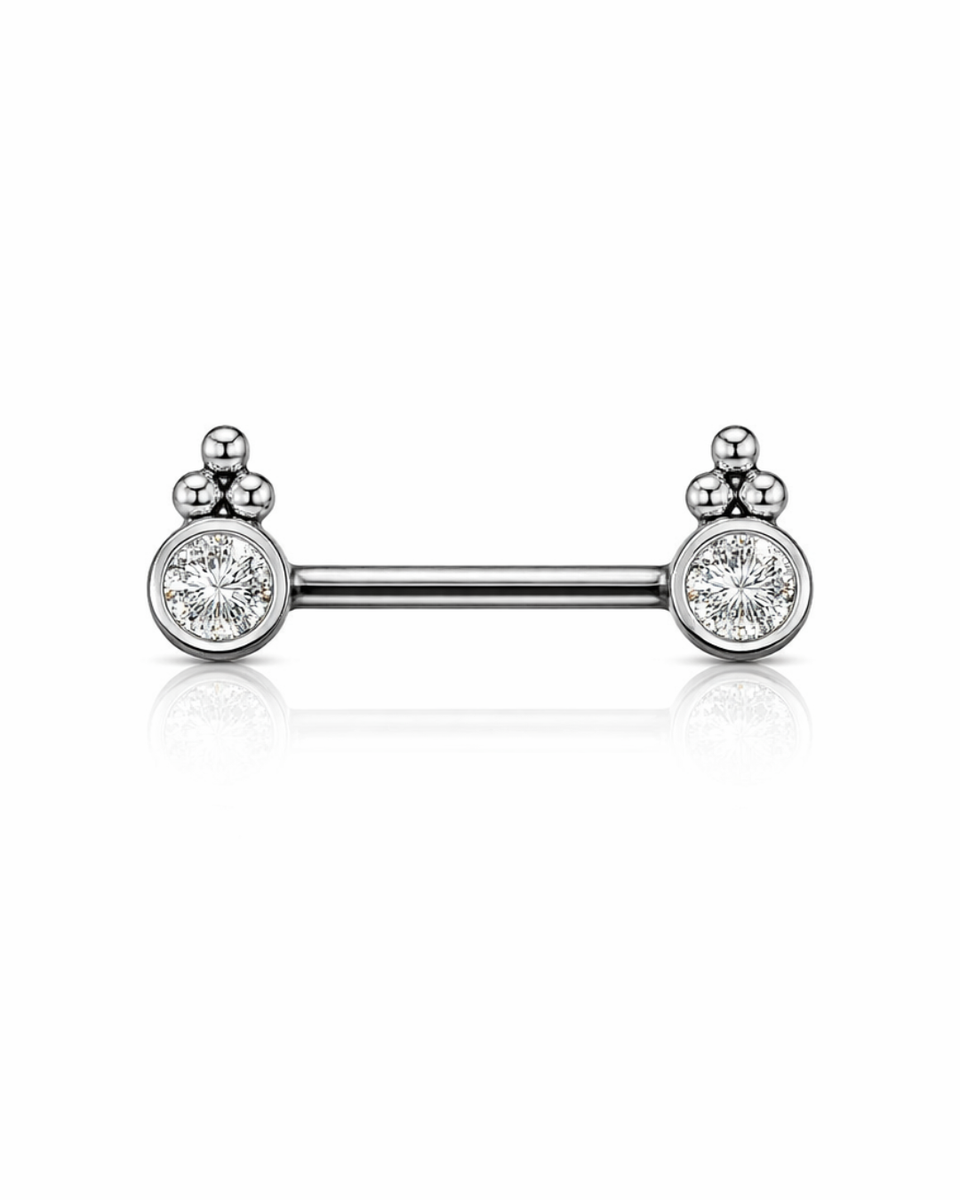 Kirurginteräksinen nännikoru hopean värisenä. Sisäkierteet