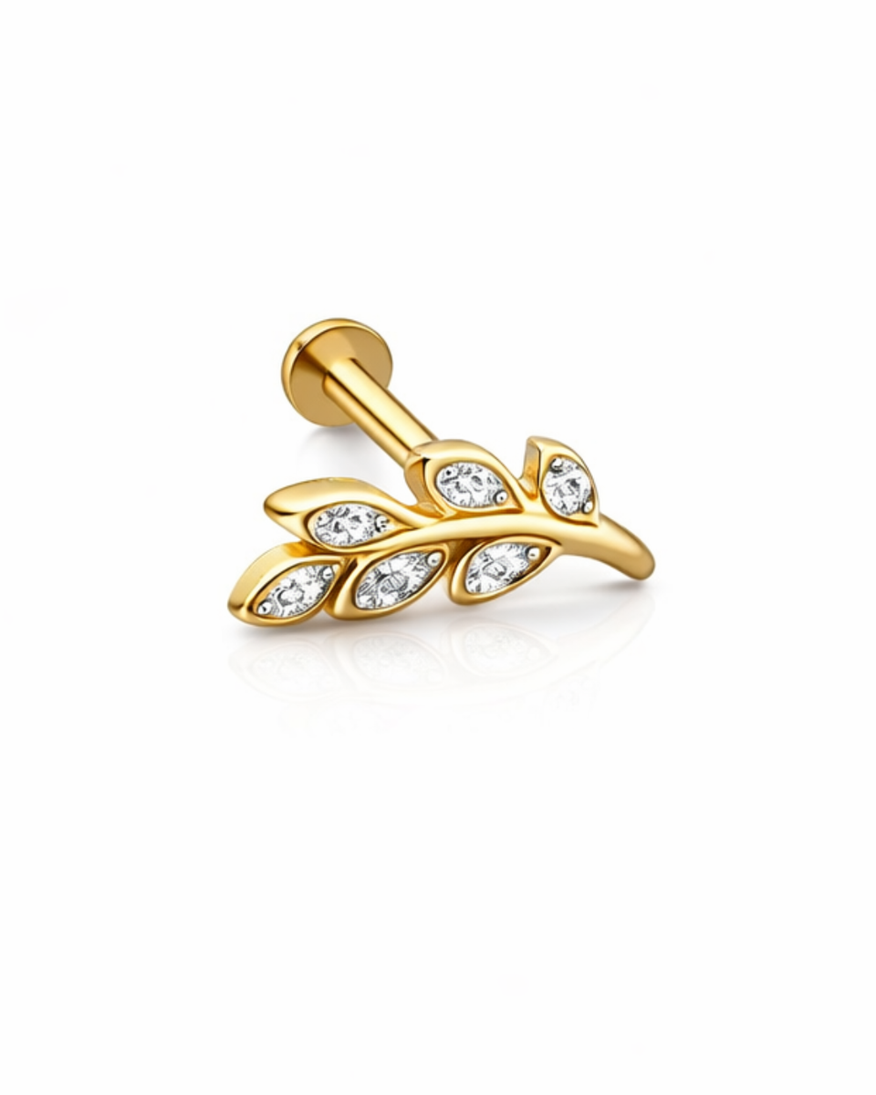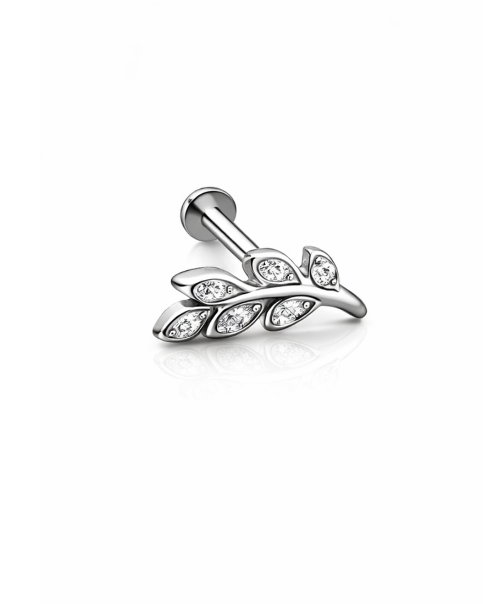 Kirurginteräksinen labret ulkokierteillä. Päässä koristeellinen lehti timanteilla. Kahdessa eri värissä!
