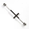 Upea, kirurginteräksinen industrial-lävistyskoru palloilla. Keskellä iso risti. Kummassakin pallossa kierteet.